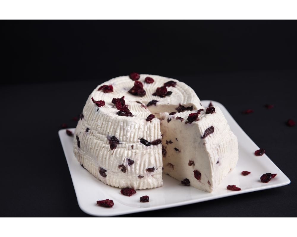 Ser kwasowo-podpuszczkowy z mleka krowiego niepasteryzowanego z dodoatkiem żurawiny.
